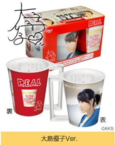 「カップヌードルリフィル用AKB48マグカップ カップヌードルリフィル付」は、AKB48のメンバーのありのままの姿を描いたカップヌードルのテレビCM「REAL」シリーズに出演した、大島優子さん、高橋みなみさん、小嶋陽菜さんの3人の写真とサインが入ったオリジナルリフィル用マグカップとカップヌードルリフィルが、それぞれセットになった商品です。