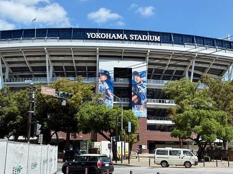 この正面から左へ100mくらい行ったところの「ベイストアパーク」の裏に自販機があって、ハマスタに入ることなくドリンク買って・・・