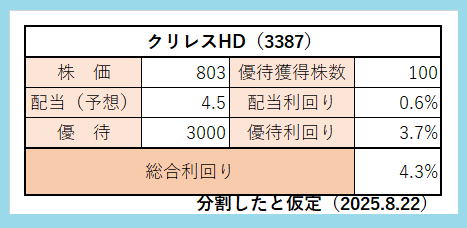 こんにちは!hibivenです☆先月の話ですが、【クリレスHD(3387)】が株式分割を発表しましたね!8月末に1→2株となります。優待額は変わりますが、分割後も100株から優待がもらえます。*配当は1/2で計算。8万ちょっとで毎年3000円分もらえるというのは嬉しいですね配当も少しずつ増配してくれています私は200株保有しているので、400株となります。今後は5000円×年2回もらえるようになります取得価額で計算すると分割後は総合利回り 6.4% に!長期保有でほったらかしながら優待を楽しむのが一番ですね!⇓⇓楽天証券は初心者でも使いやすい⇓⇓⇓⇓積み立ては楽天カードが便利⇓⇓