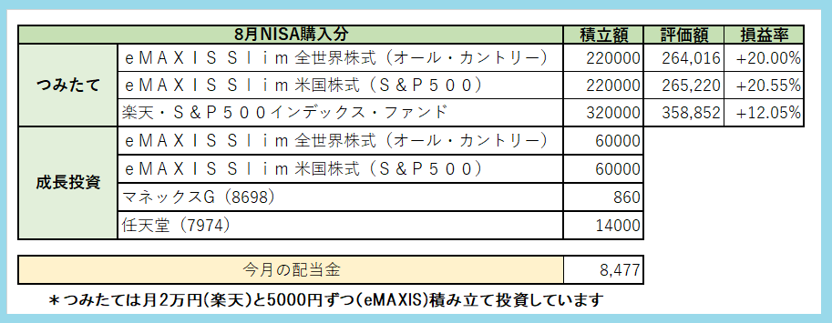 こんにちは!hibivenです☆早いもので8月も最終日ですね今月は19日に日経平均が最高値を更新しましたねそのまま続くかと思いきや、後半にかけて下落気味になっています8月のNISA利用はこちら⇓⇓つみたて枠のS&P500連動の2つの損益率はほぼ変わらずです。オルカンはちょっと上昇してきましたね成長投資枠の投資信託はいつもの買い替え分です。そして個別株は昨日のブログで書いていた【かぶピタッ】で購入した2銘柄です金額指定で購入できるので、キリのいい数字になっています9月は下落傾向が強い月と言われていますが、どうなるかな??7月のNISA利用はこちら⇓⇓⇓⇓楽天証券は初心者でも使いやすい⇓⇓⇓⇓積み立ては楽天カードが便利⇓⇓
