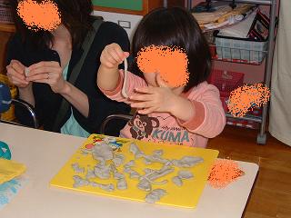 日曜日の立春を過ぎ、 昨日から気温が高めな我が街。。今日も朝から雨が降り 道路はザクザク ベチャベチャでした。。。 今日の園開放は雪遊びの予定で、 外の坂を使ってソリ滑りをしたりスコップで穴を掘ったり・・・・といろいろ考えていたのですがあの雨じゃダメだ・・・・と思い、 朝のうちに外遊びは中止に決定。。 なにをするか考えていなかったので(←コラー!)、 中止を決めてから考え今年度1度もやっていなかった粘土遊びをすることにしました。。 問い合わせがあった人や 朝 子どもたちを送ってきたお母さんで下の子を園開放に連れてくるお母さんには、 外遊びの中止を伝えたのですがそのほかの人には伝わらなかったので 参加人数も少なくて今日は10組の親子でした。。。 またまた年中の保育室を借りて、 そこで粘土遊び。。。今日初めて出した粘土だったので、 最初は固かったのですがみんな一生懸命こねこね・・・・とやって それから細くしてヘビを作ったり粘土板の型に粘土を押しつけて 動物を作ったりしてました。。。作品がひとつできあがると「せんせい、 見てみて~~」と言って 自分が作った物を見せてくれたり、 「○○(名前)も上手でそ~~(でしょ~)」と言って自分の作品をお友達やお友達のお母さんに見せていました。。お母さんたちも一緒にやってもらったのですが、 みなさんけっこう器用で?アンパンマンとか いろいろな動物とかを作っているお母さんがたくさんいました~~~わずか30分ほどの時間で、 子どもたちはまだ物足りなさそうだったけどまた今度やろうね・・・・・と約束をして、 オヤツの時間にしました。。 今日読んだ絵本は・・・・・・。。。。。。ばばばあちゃんの 「そりあそび」です。。。本当は ソリ遊びをする予定だったので、 選んでおいたのです。。。 ソリ遊びはできなかったけれど、 そのまま読みました。。。 1学期や2学期の最初の頃は、 こぐまちゃんシリーズとか 2歳くらいの子どもたちでも飽きないような短い絵本を読んでいたのですが、いまの時期は 4月から幼稚園に入園予定の子がほとんどで、 幼稚園に入れば このくらいの長さの絵本は 毎日のように読むので少しずつ長い絵本にも慣れてもらおう・・・・・と思い、 2学期の後半から長めの絵本をチョイスしています。。。 今日も、 誰1人途中で脱走?する子はいなくて おしゃべりする子もいないしみんな真剣な表情で わたしが読む絵本に見入ってました。。。 ほんの少しゆっくりめに読んだから、 5分くらいかかっちゃったけどそれでもみんな、 上手に見ることができました~~ 今日は10組だったから、 ほのぼのと のんびり遊んだりすることができ私自身も楽しかったです次回は2月27日。。。 おひな様の人形を作ります。。 園開放が11時半に終了して、 急いで片づけをしてからお弁当を食べ12時から合奏の練習。。。 (お弁当も流し込むように?食べた・・・・)今日は、 風邪で休んでいる子が なんと!? 3人もいて木琴グループは6人しかいないのに、 たったの3人。。。 練習しないワケにはいかないので、 いままでやったところの復習をしてマンツーマンで練習する子は一緒に練習をして、 今日の練習を終えました。。 おうちでも練習をしたいのですが・・・・・と言う協力的なお母さんもいて今日楽譜を作成し、 家庭での練習もお願いすることにしましたお母さんのほうからの申し入れは、 本当にありがたいです。。。 明日は雪中運動会の予定でしたが、 気温の高さで雪がベチョベチョなのと風邪で不調な子どもたちが多いため 中止することになりました。。。 「すいとん」は予定どおり、 作ります おかげで?、 明日は練習の時間がとれたので 最後の部分をミッチリ?練習したいと思います。。。 頑張るゾ~~!