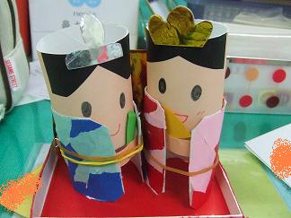 土曜日にお楽しみ会を終え、 振り替え休も明けて今日から 新しい1週間が始まりました。。。。 先週ピークだった風邪も少しずつ落ち着いて、 今日のお休みは1人!!このまま残りわずかな3学期を 元気に過ごして欲しいものです。。。 来る日も来る日も練習に追われていた日々から解放されて、子どもたちも そして私たち職員も!? ホッとして こころにも余裕が。。 きっと子どもたちには もともと焦りなんてなかったんだと思うけど、私たち職員の焦りや不安が 子どもたちにも伝わっていたんだろうなぁ・・・といつも終わってから反省します。。。 子どもたちが本番を楽しんで、 自分のちからを出し切れたことがいちばんよかったのでは・・・・?? 土曜日のお楽しみ会のあと、 片づけと同時進行で ひな人形を出しました。。 幼稚園のひな人形は、 わたしが勤め始めた頃からすでにあったのですが7段飾りの立派なもの。。。 しかし、 だいぶ古いもので 土台となるひな壇は なんと木製!! ひな壇を組み立てて、 上に人形たちを飾りましょう・・・・・・・・・と少しでもひな壇に触れると、 グラグラグラ~~~~・・・と揺れていまにも倒れそうになります。。。 毎年そんな状況で飾っていて わかってはいたんだけど どうにもできずそのまま片付けられて、 翌年また同じ状態で飾る・・・・ということを繰り返してきました。。。 今年もやっぱり同じ状態だったのですが、 たまたま居合わせた副園長せんせいが グラグラのひな壇をみて「すごいゆがんでるなぁ~~!」と言いながら、 直してくれました。。。。 いままでグラグラだったのが、 ほとんど動かなくなったの!!! やったぁーーーー さすが元?大工です。。。。 ミミの新しいおうちを1人で作ってくれただけあります。。。。 ありがとうございました!!! ・・・・・・・・・そんなワケで、 ふっるーーーいおひな様も無事に飾られ子どもたちは今日登園して、 飾られているおひな様を目にしました。。。 ←ケータイで撮ったからボケてます・・・・ 「うちも飾ったよぉ~~~」「うちは男ばっかりだからない!」 (←ちょっとカワイかった)などなど、 さまざまな声が聞こえました。。。 ちょうど、 今週ひなまつりの製作をほとんどのクラスがするので本物のひな人形をみて、 お部屋で作業をするクラスもあるようです。。。 去年のいまごろもおひなさまを飾って、 各クラスで自分だけのひな人形を製作したのですが、 ちょうど1年前くらいに満3歳で入園したHくん(現在は3歳クラス)もひとつ上のお友達に混ざって わたしと一緒に製作をしました。。。 製作をしているときはとってもご機嫌でやっていたんだけど、マイひな人形ができて じゃあホールに本物のおひな様を見にいこうか・・・・とみんなで見に行ったら 急に大号泣 そのときは お母さんを思い出したのカナ・・・?と思ったけれどもしかしてコワかったのかなぁ??? 今日 そのHくんに聞いてみたけれど、 当然のことながら覚えてませんでした。 我が家にも、 わたしが産まれたときに 母方の祖父母が買ってくれた7段飾りのおひな様があるけれど、 しばらく飾っていません。。。。 一応、 自分で買ったお内裏様とおひな様だけの飾りは飾ってるけど嫁に行き遅れているのは 7段飾りを飾ってないから・・・・? (あくまでもひな人形のせいにする・・・) 飾れるスペースと時間の余裕があったら、 飾りたいなぁ。。。 今日はクッキー作りをするクラスもあって、 甘いニオイのする園内でのんびりと過ごすことができました~~ 今月の1日に 市内のレストランからもらってきた 「お菓子のおうち」。。。2週間以上 幼稚園に飾って、 うちの子どもたちも土曜日お楽しみ会を見に来てくれたおうちの人たちも 十分楽しんだのでお隣の姉妹園に お嫁に?行きました~~ 今日は副園長せんせいのお話があったので、 お話のあとクラスごとに お菓子のおうちを見納めして、 さようなら。。。。 姉妹園で飾られたあとは、 市内にあるもうひとつの姉妹園にも飾られる予定です。。。 きっとまた ペロ・・・・っとなめてしまう子がいるんだろうなぁ。。