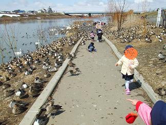 お母さんと離れての登園2日目。。。 2日目にして、 いきなり園外保育へ行ってきました!! うちの市のとある河川敷には、 毎年この時期になると 白鳥が飛来して羽根を休めています。。。それで、 その白鳥たちに会いに行くのが 毎年恒例になっていて入園からまだ日が浅いにも関わらず クラスごとにお出かけをします。。。 本当は、 年長さんが昨日で 今日が年少だったんだけど昨日天気が良くなくて、 年長さんは白鳥たちに会えなかったので今日リベンジで? 一緒にお出かけをしました。。。 年少クラスは昨日の帰りの会の際に 担任のせんせいが「明日はバスに乗ってお出かけするよ~~~」と言ったことがよっぽど嬉しかったらしく、 おうちに帰って 「早くバスに乗りたいぃぃぃぃ~~~」 ・・・・・・・・・・と、 泣いた子もいたそうな。。 ヽ( ̄▽ ̄)ノ ナハハ♪ 今日は誰も泣くことなく登園し、 朝からお出かけを楽しみにしていた子どもたちですが、ハイテンションのままバスに乗って しゅっぱ~~つ! 園からはバスで20~30分ほどのところにある河川敷なのですが道中は子どもたちもおとなしくバスに乗り、誰も席を立ったりすることなく キチンとお約束を守ってイイ子でした 河川敷に着いてまず目についたのが、 ものすごぉ~~~~い数の鴨・カモ・かも。。。。。 ↑ 両サイドにブチブチ・・・といるのが鴨です。。。 中央で転んでる人発見!カモは、 おそらく数万羽はいたと思われます。。。 ものすごい数のカモと、 川にいる白鳥に 子どもたちのテンションはマックスに!! ( ̄∀ ̄*)イヒッ 無数にいるカモをめがけて、 一目散に走り出し 追いかけ回してました。。。 ブワ~~~~~ッと群れで飛び立つカモたちにも動じずひたすら近づいていこう・・・・と、 追いかけ回して 話しかけて。。。 ?? 「待て~~! ちょっと待てよぉ~~!」って一生懸命言ってたけど、 カモさんには通じたカナ?? テンション上がりっぱなしの子どもたちがほとんどの中鳥がコワくて固まってしまう子もいて、 その子たちはずぅ~~~っとわたしのそばにいました。。。 ↑ この2人はずーっとわたしから離れず・・・・ 彼らはわたしにベッタリくっついたまま鳥を見ていましたが時々 バサバサバサ~~~~・・・・・・・っと飛び立つ鳥に ビクッ!っとなりしまいには うえぇぇぇ~~~ん・・・・と泣き出しちゃいました。。 。・゚゚・(≧д≦)・゚゚・。エーン!! カワイィ~~~ しばし、 白鳥&カモの観察?を楽しんだあとまたバスに乗って、 幼稚園へ戻ってきました。。。。 2日目にして 園外保育に行ってしまいましたが、 勝手にどこかへ行ってしまう子もいなくて、 みんな言うことを聞いて事故やケガもなく 無事に楽しく行ってくることができました~~ もっともっと暖かくなったら、 またどこかへ行きたいネ~~~ 明日は、 お母さんたちが幼稚園に来て クラスで顔合わせをします!親子で顔合わせをしたあとは、 お母さんだけお部屋に残り子どもたちはホールに移動して クラス役員を決定します。。。 子どもたちは園長せんせいとわたしの2人で見るんだけど、 明日は 紙芝居を読んで おやつ(グミ)を食べさせて まだ終わらないようだったら、 もうひとつ紙芝居を読もうかな~~~と思っています。。。。 どうか無事にスムーズに? 役員さんが決まりますように。。。