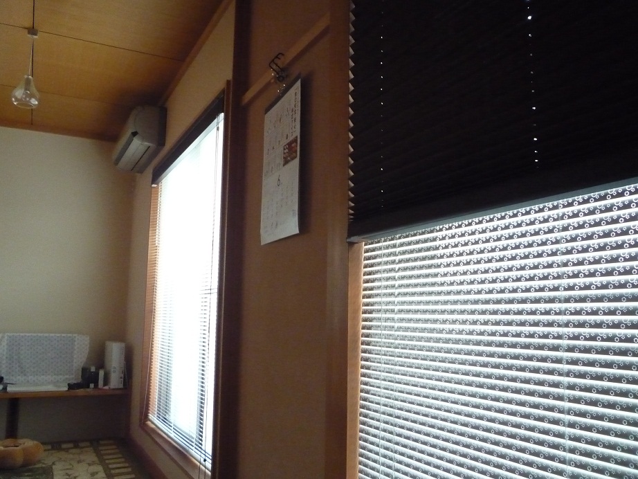 部屋にブラインドがつきました実はツインタイプにしようと思い、私の発注ミス。でも今はこれがとってもお気に入り。下の写真は左から障子枠にブラインドが2本付いている。真ん中は全閉。右はアップの写真。手前のブラウンのブラインドは西日が強い為、遮光3級。和風の造りですが雰囲気を変えたくて障子を外しブラインドにシースルーカーテンの代わりでなかなかいい感じ。これはバブル(ホワイト)という商品。他にも柄があった。ブラインドで夏の日差しが和らぐと共に適度なそよ風が入り、。エアコンもブラインドがついて今の所はつけていない。日陰になり、風が入るとこんなに涼しいのね。夜は外から確認した所、75%位閉めると人影は分からなかったので一安心。昼間の方が50%位でも部屋が暗いので見えないと思う。春からの日焼けも止まった。秋から冬にはきっと心地よい日差しが入ってきてまた、。セール中でポイントを使って購入。インテリアふじさん、いいですよぉ。ニチベイ デザインドットブラインド ユニーク25 スラットインテリアふじ