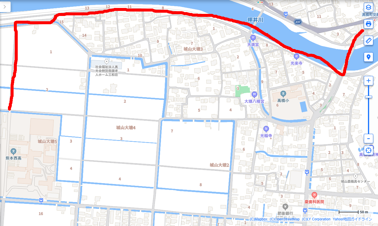 県道1号線(藤崎宮~上熊本の道)に出る。