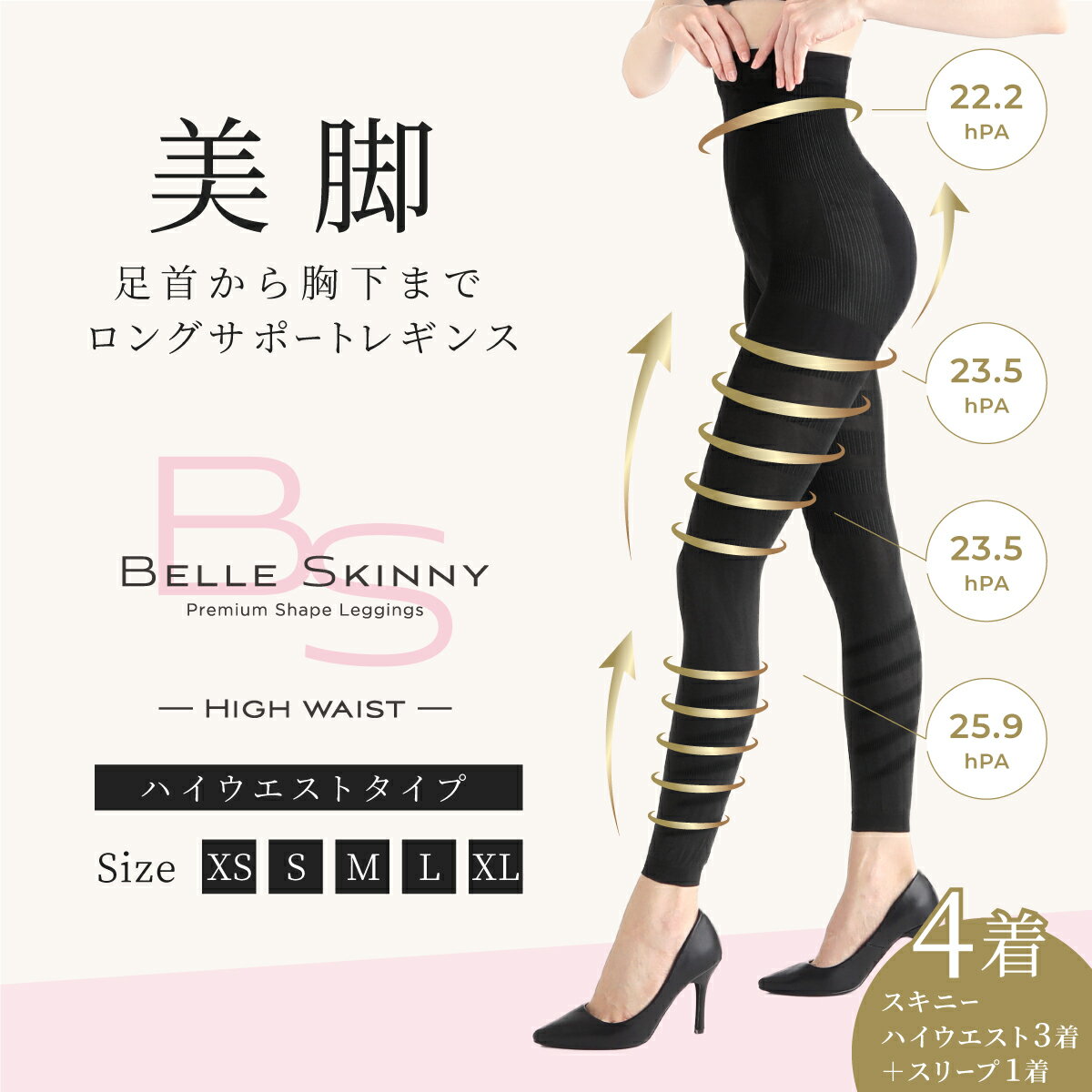 着圧レギンス【1枚あたり¥2,679】ハイウエストタイプ (3着セット+ベルスリープ1枚) 着圧スパッツベルスキニーハイウエスト バンビ美脚 脚痩せ 下半身ダイエット スパッツ むくみ 骨盤 加圧 痩せタイツ 補正下着 骨盤ダイエット シェイプ プレミアム
