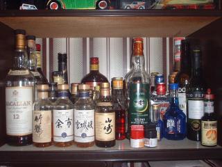 おっと、下の写真は本棚を整理して、一部の 酒ビン仮収納 してみたところ。
