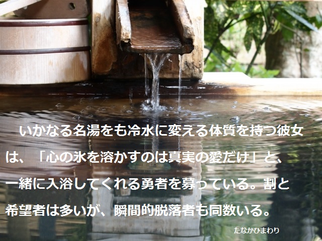 温泉に行きたい~温泉に行きたい~温泉に行きたい~↑これは書き出し小説。by.たなかひまわりってかね、追い炊きできないから冷えた体で入ると瞬時にぬるま湯になって温まれないの。熱いお湯を足せばいいじゃんって思うだろうけど、お湯の量ってのが決まってて、一人で使いすぎると家族の分がなくなっちゃうのよ。沸き増しボタンがあるんだけど、なんか反応しないんだよね。きっと何か間違えてるのかもしれないけど、まあいいっかってそのままにしてる。前に勤めてた近くの温泉に行けばいいんだけど、変な辞め方しちゃったから行きづらいし。^^;森林浴兼ねて、山の温泉に行きたいわぁ♪海を眺めながらでもいいわね。^^あーあ、温泉に行きたい。たなかひまわりの小説・詩・エッセイ