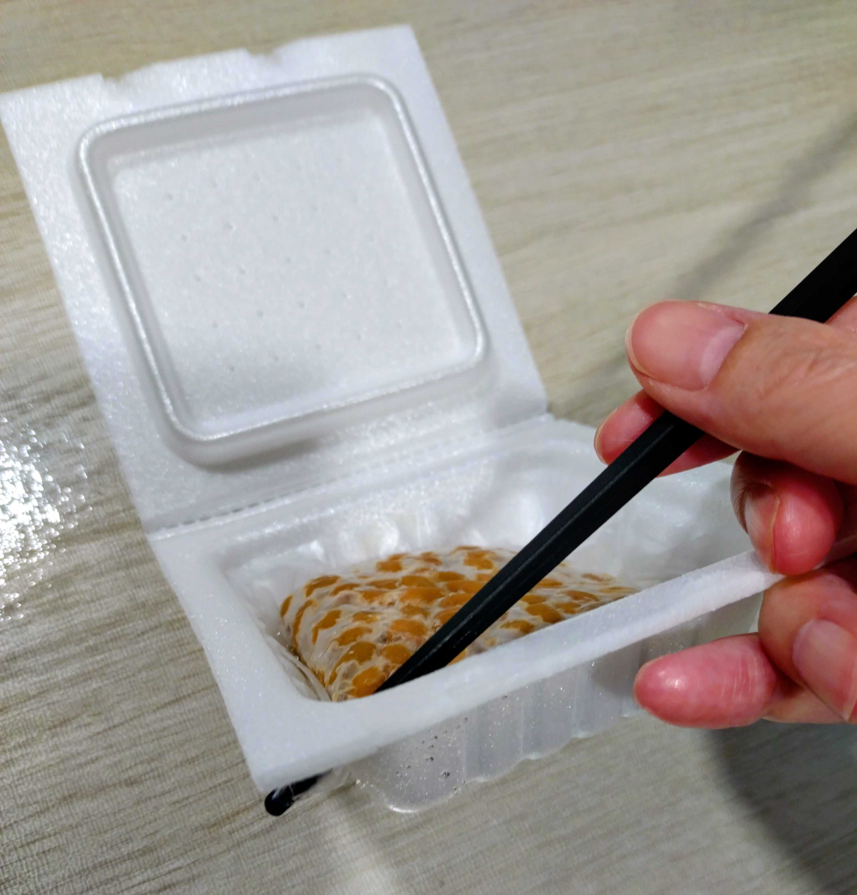 箸で納豆のフィルムごと容器にぶっ刺します。