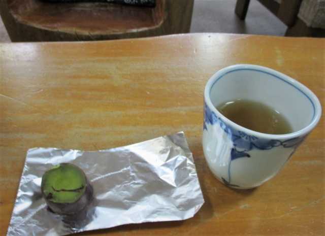 ロビーでいただいた、サルノコシカケ茶とお芋。