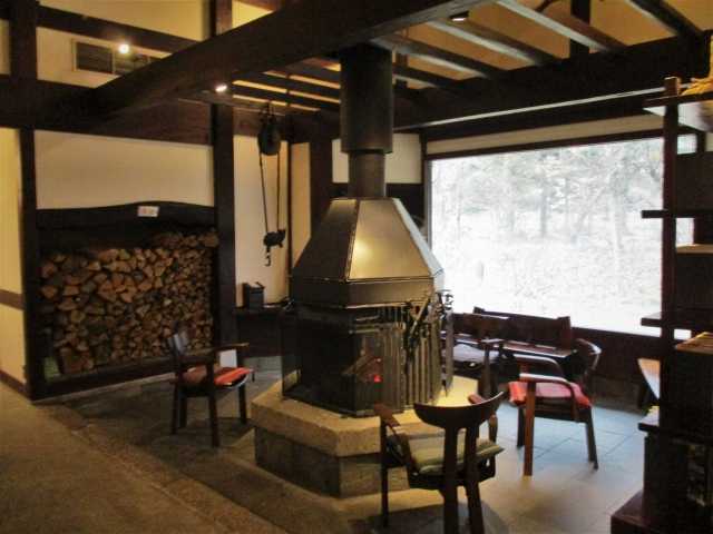 その向こうに、薪の暖炉のあるスペース。 あったかいにゃ。