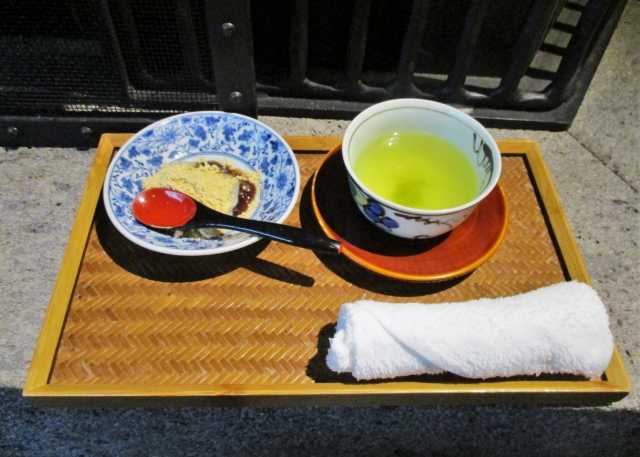 暖炉脇でチェックインと、いただいたウェルカムのお菓子は「きな粉餅」。 ![]()