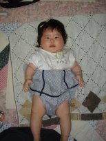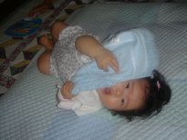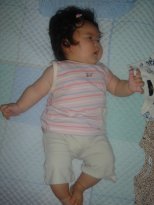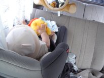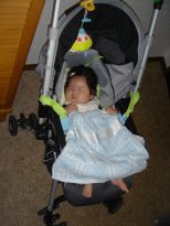 今日は友達のYちゃんと会う約束をしていたので、お出掛け♪Yちゃんの住むT市の大型ショッピングセンターで待ち合わせ。電車でも行けるんだけど、みちゃを連れて大荷物…って事もあったので、車で行くことに。お出掛けだから~と、おNewのショートオールを着せたのに、荷物を準備してる間に飲んだ母乳をでろーっと吐いて汚された。ここまで来るけど、寝返りは出来なくて仰向けに戻っちゃう。この数分後、吐いて着替える事に(--)着替えさせてから吐いた分くらい飲むかなぁ?とおっぱいしたら、寝ちゃった(>___