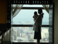 今日は2度目の結婚記念日でした。と、いうわけで、結婚式をしたホテルで食事してきました。ダンナくんが有休取ってくれたので、ディナーかランチが…と悩んだ結果、ランチに。平日だし、ランチの方がきっとゆっくり出来るだろうと言う事と、みちゃを連れて行っても、ランチの時間帯の方がお客さんが少ないだろうと言うことで。最初はみちゃを預けるか預けないかで悩んだけど、予約の電話を入れた時に4ヶ月の子供がいるんですが…って聞いてみたら、「当店はお子様連れも大丈夫です」って回答だったので、3名で予約した。披露宴をした会場のあるホテル17階にある鉄板焼きのお店。バンケットと同じ西側に窓があるので、結婚式の時にゆっくり眺められなかった景色を眺めてきました。天気も似たような感じだったので、2年前もこんな感じだったよねぇ?なんて。去年は東側にあるお店でディナーだったので、景色は全く違ってました。お寺のライトアップが見えてた(^_^;)しかも、1周年記念無料ディナー招待券の期限が切れる11月に行ったし(^_^;)去年の今頃は、私はつわり真っ最中、ディナーどころではなかった(笑)結婚記念日って事を伝えていたので、シャンパンのサービスをしてもらった。プレゼントにバラ1輪。何か嬉しかったな~(^m^*)食事は違うコースを頼んで半分ずつ。「和牛スペシャルランチ」・じゃがいものスープ・ボイルソーセージザワークラウト添え・シーフードハンバーグ 野菜たっぷりソース・和牛フィレステーキ(60g)・温野菜・御飯、京漬物・季節のサラダ・デザート・コーヒー又は紅茶「比叡」・和風前菜(鰹のたたき, ちまき麩, もずく酢)・鴨のサラダ仕立てはち蜜入りドレッシング・すずきと穴子の京湯葉焼き・和牛フィレステーキ(70g)・御飯/漬物/味噌汁・デザート・コーヒー又は紅茶デザートはガトーショコラと蜂蜜のアイスクリーム、シャンパンのジュレ。めちゃくちゃ美味しかった~。いつものごとく、みちゃはベビーカーでおとなしくしてくれず、抱っこして食べる事に(T_T)ゆっくり食べる事は出来たけど、大人しくさせなきゃ周りに迷惑かけちゃう…と気分的にゆっくりできなかった。一番近くの席(大きな鉄板の端と端)にいたご夫婦に「可愛いねぇ」って話しかけられた時に「すみません。うるさくして」と謝った。せっかくホテルでランチしてるのに、子供の声はうるさいよね。抱っこしてたらおとなしくしてたから、ご夫婦はゆっくり食事されて帰って行ったけど、申し訳なかったなぁ…。やっぱりお留守番してもらわなきゃダメだったかなぁ。デザートが出るまで時間があったので、我慢がきかなくなって来たみちゃを抱っこして、窓の外を見せに。興味津々で窓の外を見てた。と、いうか、窓の下を見てた。高さが気になる?髪の毛、ひっぱられるので、食事の前に縛ったんだけど…はねてるなんて知らなかった…(T_T)お店の人も親切で、みちゃによく話しかけてくれて、みちゃご機嫌で愛想振りまく(^_^;)やっぱりこのぷくぷくほっぺが人気。「おっこちそうだね~」とな。駐車場に下りるエレベーターの中で一緒になったおじさん、おばさんにも愛想振りまく。「可愛い~」と言って貰ってますます笑顔。愛想振りまきすぎ(^_^;)帰りにあるお店に寄り道する事に。そこに行くまで、みちゃはチャイルドシートでベルト握って爆睡。食べてる時に寝てくれたら良かったのに(^_^;)窮屈そうになって来たので、ベビーシートを外してみました。外すと座り心地悪そうに見えるなぁ…。クッションがなくなったからかな?単に見慣れないから?チャイルドシート用のカバーシートが欲しいなぁ…。汗が凄いし、カバーつけた方が簡単に洗えそうだし、汗も吸い取ってくれそう。出産祝いにも人気です。チャイルドカーシートカバー可愛すぎるかしら(^_^;)それともベビーカーにつけてるくまのプーさん ひんやり快適マットをもう一組買おうかなぁ…。寄り道したお店は、手描きイラストのTシャツを作ってくれるお店。大まかな場所しか覚えてなかったけど、無事到着。さっそく3人お揃いのTシャツを記念に発注してきました。できあがりは1ヶ月後。楽しみです♪