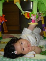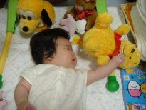 今日は雨で外には出られませんでした。本日7時起床のみちゃ。早起きしたせいか、雨の日だからか妙に寝てくれました。寝る前が大変だったけど…。眠いのに寝られないらしく、愚図りまくり。仕方ないので抱っこしたままで歌って踊る私…(--;最初は機嫌良かったけど、段々愚図る。最後にやったこと。お腹の上にうつ伏せにして腹筋で顔を近づける。大喜び。それは良いけど、かなーり辛いものがある(^_^;)お腹に6.5キロ乗せて腹筋って辛いよ~。や、痩せるかしら(笑)最後におっぱいしたら、寝てくれました。もしかしたら、今日って起きてる時間の方が短くない?ってくらい寝てた。やっぱり自分で手を伸ばして、おもちゃを取ろうとするようになったようです。ぷーさん、胸ぐら捕まれてますが…(^_^;)この後、食いつかれました。振り回しながらなので、ぷーさんも手もぶれてます(^_^;)動くようになると、写真撮るのが大変になって来た~。ついでに懺悔。ダンナくん、メモリースティック壊れたみたい(^_^;)エラー出ちゃう(T_T)ごめん。帰って来たら見て~(>_