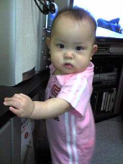 元気もあり、高速ハイハイで部屋中を動きまわり、つかまり立ちで壁やドアをバンバンし、鏡の前に行ってニッコリしたりといつものひなた☆