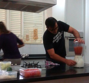 私が住んでいるコンドの管理会社主催のクッキング教室に行ってきました。アンダルシア風 ガスパチョスペイン人の先生です。先生曰く、料理はアートらしいです。スペインは夏40度くらいになるそう!!暑い時は、さっぱりした料理で、栄養も豊富なガスパチョが良いのですって。ミキサーで材料を混ぜるだけで火を使わないから簡単そう。材料は、皮をむいたトマト、グリーンパプリカ、玉ねぎ、ニンニク皮をむいたきゅうり、水を浸したパン塩、オリーブ油、ワインビネガーパンを入れたらトロっとしてコクがでるみたいです。私は美味しかったけど、夫に出したら、野菜ジュースか?!って言われそう。全部手軽に手に入る材料だから、一度作ってみようかな。次回は27日、同じ先生にシーフードパエリアを教えてもらいます。こちらも楽しみ♪