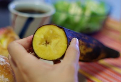 マレーシアには日本では見たことも無いような果物がたくさん売っています。普通のバナナの隣に長さ30センチ級、太さ直径5センチの巨大バナナが売っていました。でも皮が真っ黒!私、これ腐ってるんじゃない?夫、おもろいから買う!!と夫が譲らないので、買ってみることに。1本 3.5リンギ(120円くらい)高級スーパーなのでちょっとお高いです。中は全く腐っておらず、むしろシッカリしている。それに皮が薄い。普通のバナナより歯ごたえがあるし、食べごたえバッチリ。半分はパンに入れてみました。とろーり、あまーいお芋さんみたいな触感。おいしゅうございました。楽天日記からアメブロへお引越ししました。今後はアメブロへお越しください。天使のさざれinマレーシアhttp://ameblo.jp/104sazare/