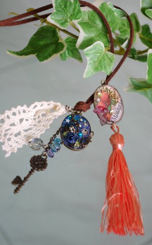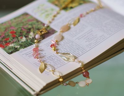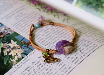 日本から本革の紐を購入してきたので試しに作ってみました。アメジスト(紫)、ラリマー(水色の)、ペリドット(緑)難しいテクニックを使わずに簡単に作れるものがいいなぁと研究中。石は付け替えてもいいし。金具も不要。革だから身に着けているうちにいい味が出てくることを期待しています。英国のお花の本の上で撮影してみました。怖い顔のにゃんこのチャームです。