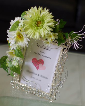 日本にいる頃に大変お世話になった友人が結婚することになり結婚式のウェルカムオブジェをマレーシアからプレゼントしました。日本のような気の利いたウエディング用品のショップがなかなか見つからず(私が知らないだけかもしれませんが)写真立てを土台にしてワイヤーと造花で飾りつけしました。後から写真を入れて使ってもらえたら嬉しいなぁと思っています。友人から最高の結婚式だったと報告を頂いて私もほくほくした気分です。末永くお幸せに(*^_^*)