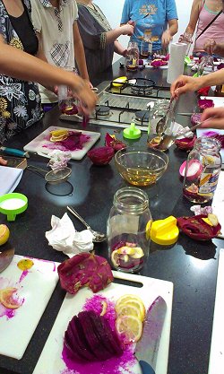 5月に講習会で教えてもらったフルーツ酵素ドリンクを自宅でも作ってみました。講習会の様子・・・そして自宅で・・・リンゴ、レッドドラゴンフルーツ、レモン、ハチミツ、ブラウンシュガーです。ちょっとフルーツの量が多すぎました。反省。毎日かき混ぜて、2週間くらい経つと小さな泡が出てきました。どうなったら完成なのか分からないけど一応、これでいいのかな?先生は2週間以上置かない方がよいと言っていたし。ドラゴンフルーツは溶けて種だけになってしまいました。でもドラゴンフルーツを入れたので、とっても色がキレイ。フルーツをこして、お酒の瓶に移し替え(色がついている瓶で保存した方がいいそうです)冷蔵庫に保存。こうしておくと、酵素が休眠するそうです。飲むときは常温に戻して、お水で4倍に薄めて飲みます。フルーツのカスはもったいないのでカスピ海ヨーグルトに混ぜて食べました。体の中からカ~っとする感じがします。でも酔っぱらう感じではないし、これが酵素なのかな?2週間もかかるけど、日本で酵素ドリンクを買ったらびっくりするほど高価だし自分で作ったらお得ですね。マレーシアは果物が安くて助かります。今はリンゴで自家製酵母を育てています。自家製酵母でパン作りがずっとしてみたかったんです(^.^)