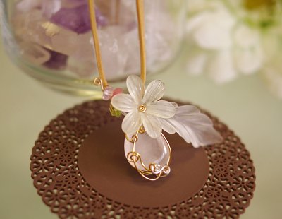 時間のあるときに、ワイヤーワークの作品も作っています。いくつか作りましたので、少しずつブログにUPしていきますね。穴が開いていないローズクォーツのタンブルをワイヤーで留めて、ふわっとしたイメージを出したかったのでお花と葉っぱのアクリルパーツと組み合わせました。羽も可愛いけど、こういうのも可愛いかなと思います。