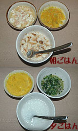 夕ごはんは、お粥、味噌汁(小松菜、まいたけ、ジャガイモ、インゲン)、かぼちゃミルクスープ。