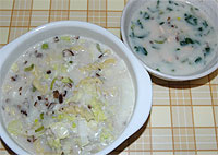 子供用は、鮭とほうれん草(どちらも冷凍)を入れて、大人用は、塩コショウで味付けしてから白菜とマカロニを入れました。