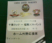 2006.8.29(火) パシフィックリーグ公式戦千葉ロッテ 対 福岡ソフトバンク(17回戦)千葉マリンスタジアム試合開始:18:16 試合終了:21:27 観客数:26828人ロッテ0-12ボーダフォン○勝投手 : 新垣 18試合 12勝 2敗 ●負投手 : 久保 19試合 7勝 10敗日本記録を樹立しました!6試合連続、2ケタ三振。なんかイマイチな試合だった。意欲とか、意地とか、感じられない試合だった。初芝さんも怒ってたよ!・・・らしい。千葉テレビで・・・。大敗っすよ大敗!7回2アウトから敬遠四球を挟んで5連打って・・・。昨日は西武もハムも負けてるのに・・・。まあ、こんな日もあるね。こんな日のチケット今日は、ルーキー古谷に頑張ってもらおう!イースタンでは、いい成績残してるし。早くも来シーズンに向けて?げっ!!!もう交代してるバーンに!