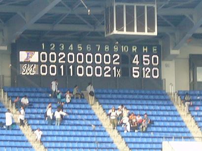 2006.9.23(土) パシフィックリーグ公式戦千葉ロッテ 対 北海道日本ハム(19回戦)千葉マリンスタジアム試合開始:13:00 試合終了:15:45 観客数:30008人○勝投手 : 小林雅 51試合 6勝 2敗 34S ●負投手 : 武田久 72試合 5勝 3敗 3S 大塚のサヨナラは最高だったけど・・・。防波堤決壊!!!小野、頑張ったのによ~!それにしても、人が多かったね。マリスタ駐車場なんて、8:30くらいには満車だったし。メッセでゲームショウ?か何かやってたみたいだから。おかげでメッセ駐車場に車置くはめに。試合内容ほとんど覚えてないな。24日の場所取りのために、前半は外で並んでたし。大塚のサヨナラは、場所取り用ガムテープ取りに行ってたし。っていうか、なぜ9回裏やってんだよ!マサさんよ~。新庄っておもろいね!チョコチョコ何かやってるし。やめるのもったいない。何話してんだろう?