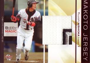 どうも。ここで一旦、現場監督です。最近、カード収集にハマリまして。キッカケはプロ野球チップスでして。っと言っても前から、プロ野球チップスは買っていまして、軽く集めてましたけど。ある日、コンビニで2袋買ったところ、ラッキーカードが出ちゃって。それで、チーム別カードパックをもらったところから始まりました。もちろんマリーンズ。お気に入りブログの方でもカードを集めている方がおられまして、気にはなっていたんですけど・・・。とりあえず、オークションでBBM千葉ロッテマリーンズ2006を購入。メモラ、パラレルの出たあとのパックで。そんなこんなで・・・。ある日、BBM千葉ロッテマリーンズカードBOBBY MAGIC 半額!をネットで発見。ファンフェスト行った時に、2割引きで売ってたんだけど、迷ったあげく購入を見送った経緯があったので、見た瞬間に即購入。そんで昨日の深夜・・・。日付は今日になってたかな?楽しみに空けたところ・・・。こんなの出ました。No,008of100西岡パッチカードじゃあーりませんか。半額で買ったのに・・・。ある意味、売れ残りだったのに。ちょっと嬉しかったっす。カード収集、熱くなりそうっす。