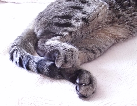 しおたんて、よく足をこうキュッと縮こめて寝てることあるw 平和そうにスヤスヤして…
