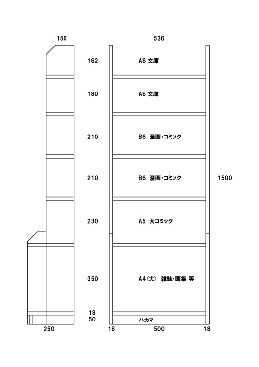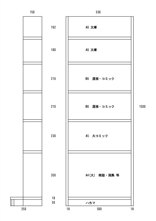 はい。ということで前々から行っていましたが、やっと自作本棚の製作に取り掛かります。いつものごとく予定なんてこれっぽっちも守れてませんが、ずずいと製作を開始していきますよ。ということで、今日はタイトルにもあるように「デザインを考える」です。こいつがホント曲者で、製作開始が遅れに遅れたのもこいつのせい。それぞれの棚の高さを入れる予定の本の種類で変えようとかいろいろ考えて、幅や高さやらいろいろ考えてたらもうわけわからんことに。予算の都合もあって、あんまり大きいのはつくれないと言うのもありますしね。どうにかまとまるのに1週間以上かかってしまいました。で、結果決まったのがコレです。素人が考えたにしてはそこそこ上手く出来てるはず。とにかく、部屋にいろんな種類の本が散乱しているのでどうにか主だったものだけでもひとつの本棚にまとめたいのです。特に雑誌とか画集とか今の本棚じゃ高さが足りなくて全然入らない。なので一段目の高さは普通より大きめにして、他の段の高さを低くするように設計しました。これで雑誌類は問題なくなるはずです。ま、俺ほど予定通りに事が運ばない男もそういないと思うので、どっかでつまづきそうだけどな!まあ、とりあえず明日は休みなのでホームセンターに行っていろいろ材料買ってきます。すべてが初めての試みなんでね、失敗覚悟でやってみますよ。ええ。 http://blog.with2.net/link.php?313409 (人気ブログランキング) http://collection.blogmura.com/plamodel/ (にほんブログ村) ブログランキングに参加しています。よろしければ支援クリックをお願いしますρ(・ω・`)ポチット
