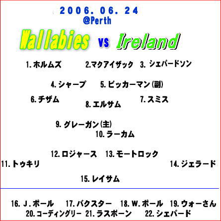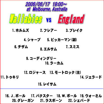 【 テスト マッチ 第1戦 】オーストラリア 34-3 イングランド !(@゜▽゜)ノ やっだ~!! 注目の第1回ヒロVPは・・・。「No.8 エルサム」&「WTB ジェラ-ド」 そして、ベスト シーン賞は・・・。「28分 ゴール内タックルで、トライ阻止 SH グレーガン」 まぁ、言いたい事は、たくさんあるのですが、まずは監督に・・・。セットプレー対策で、大型の6番・ヒーナンを入れたと思うが、前にも書いた気がしますが、まず止めた方が良いです。武器は、全面に出して戦わねば、意味が無い・・・。大きくとも並みのFLじゃ、ウォーさんを押しのけてまで居る価値が無い。 今日も、6番が、どこにいたのか分からなかった・・。しかも、ラインアウトは外すし・・。 お前は何しに来たんだと・・・。 監督が、ウォーさんは控え、そんで主将はグレーガンと決めた以上・・・。「監督、頼んだよ!!」と、いうよりは、頼むから今季で解任してくれと・・・。 今日は、相手が弱すぎましたが、これが、つまずきの第一歩の様な気がするのは、私だけか・・・?? グレーガンは、相変わらず、ワン・モーション入ってからのパス。球捌きは、昨年より悪くなった気が・・・。おかげで、チャンス・フェイズを潰し続け・・・。 まぁ、タックルは、昔に返りつつ あるだけに、今日は見れたかなぁ。。。 奪ったトライは全部、文句の付けようが無いほどのプレー。なので、おとなしくしときます。。。 あっ、そういえば、この試合一番の仕事人は・・・。カメラワークです!!前日の、南ア戦が最悪だっただけに、イングランドの素早い飛び出し(ブラッシュアップ・ディフェンスってんですか??)を、ポイントからライン際のウイングまで引き気味のカメラでとらえ、最高のアングルでした!! えーっと、業務連絡です♪昨年の、ワラビーズ観戦での経験を元に、「チケット購入ガイド」みたいなのを、作ってみました。まだ、途中なので見づらいでしょうが、まずはUPしてみます。じょじょに、更新して見やすくしますので、本当にお暇な方だけ、下記のバーナーからどうぞ♪