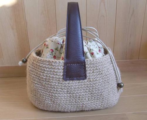 バスケット型麻ひもバッグを作りました。イチゴ柄の巾着袋を作りましたが取り外しできるので他の柄の袋を中に入れるとまた違った雰囲気のバッグに変身しますよ!
