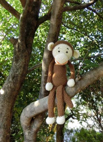 ボクの名前はモン太ありきたりな名前でしょもっとカッコいい名前がよかったんだけど一晩考えても思いつかなかったんだって・・・大好物はバナナちょっと気の弱いところもあるんだけどイベントでは看板息子としてがんばります!!ソファーに寝っ転がってるモン太君。このポーズ誰とは言いいませんがとっても似てるんですよ家でテレビを見ているあの人に・・・イギリス在住のちむちむさんのお猿の編み図を参考に作りました。ありがとうございました!