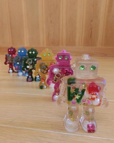 カラフルロボット作りました。レジン液をたっぷり使ったので重量感あります。お腹の中にはいろんなパーツが入っています。目がキラキラ光ります。ネジ回しもついてるよ♪スマホの半分くらいの大きさこのまま飾ってもかわいいけどいくつかキーホルダーに加工して今月末のイベントに持って行きます。