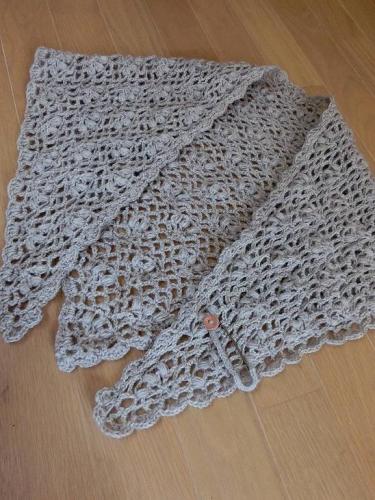 グレージュカラーの三角ショール完成しました。模様編みは編み目を間違えてもすぐには気がつかず編み進んでから間違えに気付きほどくこともしばしば・・・そうなると編む気力をいっぺんに失いそのまま放置ってことに・・・そんなんで編み始めて完成するまでずいぶんかかりました~その点麻ひもバッグはこま編みだけなのですいすい編めます。グレージュのファーを付けました。カブトピンを編みくるんで作ったショールピンです。合わせやすいナチュラルカラーお揃いでどうぞ!