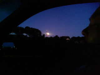 朝、いつもの楽団の練習場の文化祭があり、その会館を使っている人たちが集まって、発表の場となっていて、私たちもオープニングに演奏をしてきました。・・・これって、自分たちで参加しているのだから、(会館から、文化祭に参加しますか?ってアンケートが来ていたハズ。)「お招きありがとうございます。」って、こちらの進行役が言うのは違うんじゃね?と、毎年思っていながら、すっかり忘れて、また進行役(司会)が言ってて気づく。。ま、いっか。その後、いろいろ打ち合わせしたり、演奏会関連の仕事をこなし、さらに、演奏会関連で、みんなでお買い物に行こうと移動中。月がめっちゃくちゃ大きくてきれいだった~あぁ。携帯カメラじゃうまく伝わらないよな。助手席から運転席側の方撮ってるしっていうか、もっとキレイに見えた場所は、車で走ってて坂の上に行ったところだったから、停まれる場所がなかったんだよね。。なんとなく撮ってみた写真なんだけど。この日の月のことをサックス奏者の須川さんもブログに書いてることが判明して、「あ。じゃあ、私も書いてみよう。」という気になった(爆)なんかやっぱり空はつながってるんだよなぁ~っていうかさ