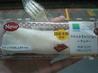 やわらかぎゅうひ包み~チョコ~スプーンでお召し上がりください仕事帰りのコンビニで発見して購入。『スプーンでお召し上がりください』なのに、フォークをくれた思わず、そっこー駅のホームで写真家に帰ってから、食べてみました。うん。フォークの方が食べやすいかもね。でも、やっぱり「ぎゅうひ」は、チョコよりアンコの方が良いね