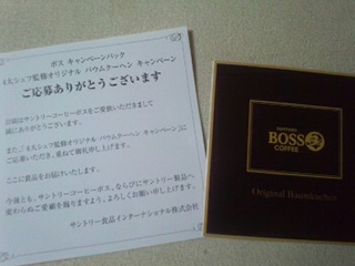 BOSSのコーヒーを4パック買って応募すると、絶対もらえる!というバウムクーヘン。締め切りが1/31だったんだけど、確か20日頃になっちゃったんだよな~出したの。まさか、ハガキに不備が…もしかして、バニラ大人気で、締め切られちゃった??とか、いろいろ考えていた頃すら、通り過ぎ。・・・で。3/4まで、ぜんぜんなんの音沙汰なく。締め切りから1ヶ月少し過ぎた3/5。ついに届きましたよ。鎧塚さんのバニラバウムクーヘンバウムクーヘン大好きっ。食べるのが楽しみっかなり前にBOSS×ファミマが出したバウムクーヘンもとっても美味しかったけどなぁ~。また出さないかな~。