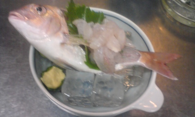 実際の画像では ないですが この前友人が 来られた時に おっ!! 鯛の姿造りしてあげよぉ~って 他には 烏賊とか 地魚の 造りを 入れて 立派なものに・・・・・・ でも・・・・・ やはり 爆笑されました。・・・・・ 「こんな こんまいの どうすん?」 もっと でかいのかと 思おっとんのに・・・ って 笑われました。 そこからの 必死?の説明!? これは 姿じゃない!! 活き造りだ!!って!! まだまだ ぴくぴく してるでしょ!! って この技術は すごいんですよ。 本当は・・・・ 生簀にこのサイズを 活かして おく 技術(麻酔針) 活かして お造りにする 技術 でも している人物(私)が どうでもいい人だから 人格が 爆笑を 誘います。