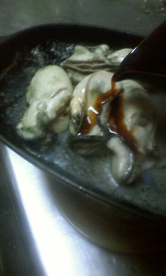 今さらですが。。。。牡蠣の新メニューステーキ皿を固形燃料で 温めバターを ぽん!!牡蠣を ドン!!両面焼いて醤油を かければ香ばしい いい匂い!! 間違いなく おいしいです。¥630!!