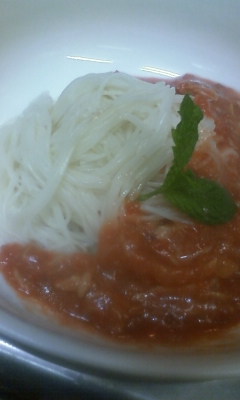 ぷち イタリアン 和風で。。。。。 そうめんで 作るとまとの 冷たいそうめん トマトソースの パスタのアレンジでです。 トマトとツナ缶で 出来ます。中には 氷を 入れてボリュームと 冷たさのを 演出しています。 まぁ お店のまかない ですけど。。。。