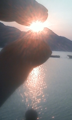 勇気を 出して 太陽をつまんでみた。 光の 道も 出来ています。 今日は 小海老を 持ち帰り かき揚げ・唐揚げに かわります。 渡り蟹のサービスも あります。
