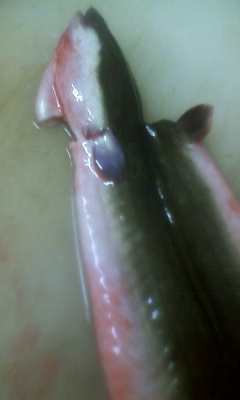 アップで 見ると よくわからない魚 正面からなら なおのこと わかりにくいですね。 少し ひいてみると オコゼでした。海で 獲れれば ¥3150の コースに 活き造りがつきます。 こちらは 遊びで 作った あこうの お造り まだ 暑いみたいですがおいしい 地魚が 待っています。!!