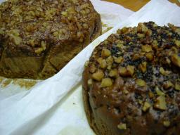 休日出勤がなくなったので、今日は思いっきりストレス解消!しちゃいました。 星型の缶で「アーモンドのケーキ」を焼きました。クリスマスっぽいでしょ。粉砂糖は、雪みたい!分かるかな?この缶はクリスマス柄なんだよ。 「バナナとクルミのケーキ」です。 いつものスタイルにレーズンをプラス。ラムレーズンがよかったかな。厚みを出してみたんですけど、食べ応えあり。 このほかにも「大納言フルーツケーキ」も焼きました。これから、「ティースパイスケーキ」を焼きます。たくさんのレーズンを、紅茶に半日以上浸けておいたんです。それ以外は全部混ぜるだけのカンタンケーキです。これは、とても楽しみなんです。残念ながら、またチーズケーキは作れない!来週こそは、チーズケーキを...。 カスターニャは今日からあの悪魔の薬を服用です。きっと辛いんだと思う。言葉を発しないだけで...。 のどが渇くらしく水を欲しがりますが、たくさん水を与えると、また吐いちゃうかもしれないので、湯冷ましを、少しずつあげてます。さっきまでは、起きてましたが、今はゆっくり眠ってます。今回は二日間だけなんですが、このまま副作用がないまま過ぎてくれるといいなぁ~。 今日もいっぱい、いっぱいありがとう!