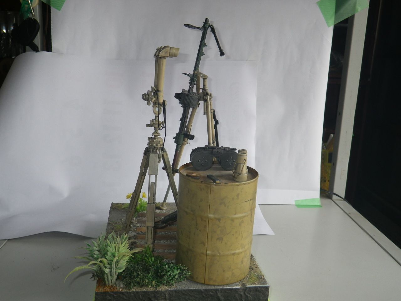ジオラマ ブログランキングへランキングUPへご協力お願いたしますドラゴン1/6 MG 15機関銃 w/トライポッド と砲隊鏡&測距儀 Telescope&Rangefinder CH75022の砲隊鏡を組み合わせてヴィネットジオラマを作成しました。①MG15は航空機搭載用の旋回機銃として1930年代初頭に開発されましたが、1940年代になると脚を付け、地上部隊や降下猟兵の装備としても使用されるようになったそうです。②マガジンは交換が容易なように設計されており、75発入りのドラムマガジンを使用しています。このドラムマガジンは銃の左右にまたがるような形で取り付けられ、サドルドラムと呼ばれています。これは両面合わせて75発×2で150発と勘違いされそうですが、左右あわせて総弾数75発だそうです。弾倉交換に要する時間は約6秒で、非常に素早く行えたそうです。MG34などのような空のドラムマガジンにベルトリンクを内蔵する方式ではなく、バラの弾を装填しゼンマイ動力で給弾する方式で、射撃前にあらかじめ装弾済みにしておかれていたようです。③この機関銃は毎分1,000発以上の発射速度を持っており、約4.5秒でマガジン内の銃弾を使い切るとの事です。そのため航空機旋回機銃として使用される際、通常は最低でも(装着済を除いて)10個以上のマガジンを機内に搭載していたそうです。④このドラム缶はダイソーの雑貨コーナーにこの形状の吸殻入れがあって天地逆にして使用しました。給油金具もダイソーの手芸コーナーで磁石式ボタンがあってそれを使用しました。ただし、ドイツ軍のドラム缶の形状はこのような物ではありません。正規販売品は中々手に入りづらい上に価格が極めて高く感じるためこのような自作で誤魔化しています。塗装はメタルプライマーを全面塗布してタミヤスプレーカラーのダークイエローで着色し黒墨汁で影落し、朱墨汁で錆溜まりを表現しました。⑤足元の埋め木もダイソーの園芸雑貨コーナーでパレット組み物を購入して仕込みました。草花は樹脂製造花を使用しました。⑥大きい岩が地表に見えて、砂利をその廻り、埋め木の間隔に敷き、その周囲に土・小粒砂を散らして地面の表情に変化をつけました。⑦土のうは前回のMG42で紹介した時と同様にだしパック利用で作成しています。⑧⑨⑩地上の玉石はじゃまな石をどけて1箇所に集積している風を表したつもりです。⑪MG 15機関銃は元々が航空用であるため、野戦で使うにはバランスが悪い(全長が長すぎ、弾倉も75発入りのみで嵩張り、連射しかできないため、地上での運用は不便)・デリケートな機関部といった面もあり好評とはいえなかったそうです。⑫⑬⑭⑮この砲隊鏡はSF14Zのようです。ドラム缶の上においてあるレンズはどの用に使われているのか皆目検討が付きません。ネット検索してもどうしても分かりませんでした。接眼レンズ右側上部よりケーブルが延びているのは光学照準器のレティクルパターンを照らすための照明装置です。夜間や目標が暗いところでは背景と黒色の照準レティクル線が同化して狙いを定めることが困難であるが、この照明装置を使うことで照準を容易にするそうです。バッテリーはパーツ同梱されてなかったのでケーブルを束ねた形にしました。⑯レンズは内部を黒着色してレンズの内側をクリヤーブルーで塗装して取り付けしました⑰砲隊鏡基部です。モールドも良く再現されています。⑱三脚基部です固定レバーや脚基部通しピン頭も表現されています。可動はしません模型としてははめ込み式です。⑲ジオラマ ブログランキングへランキングUPへご協力お願いたします
