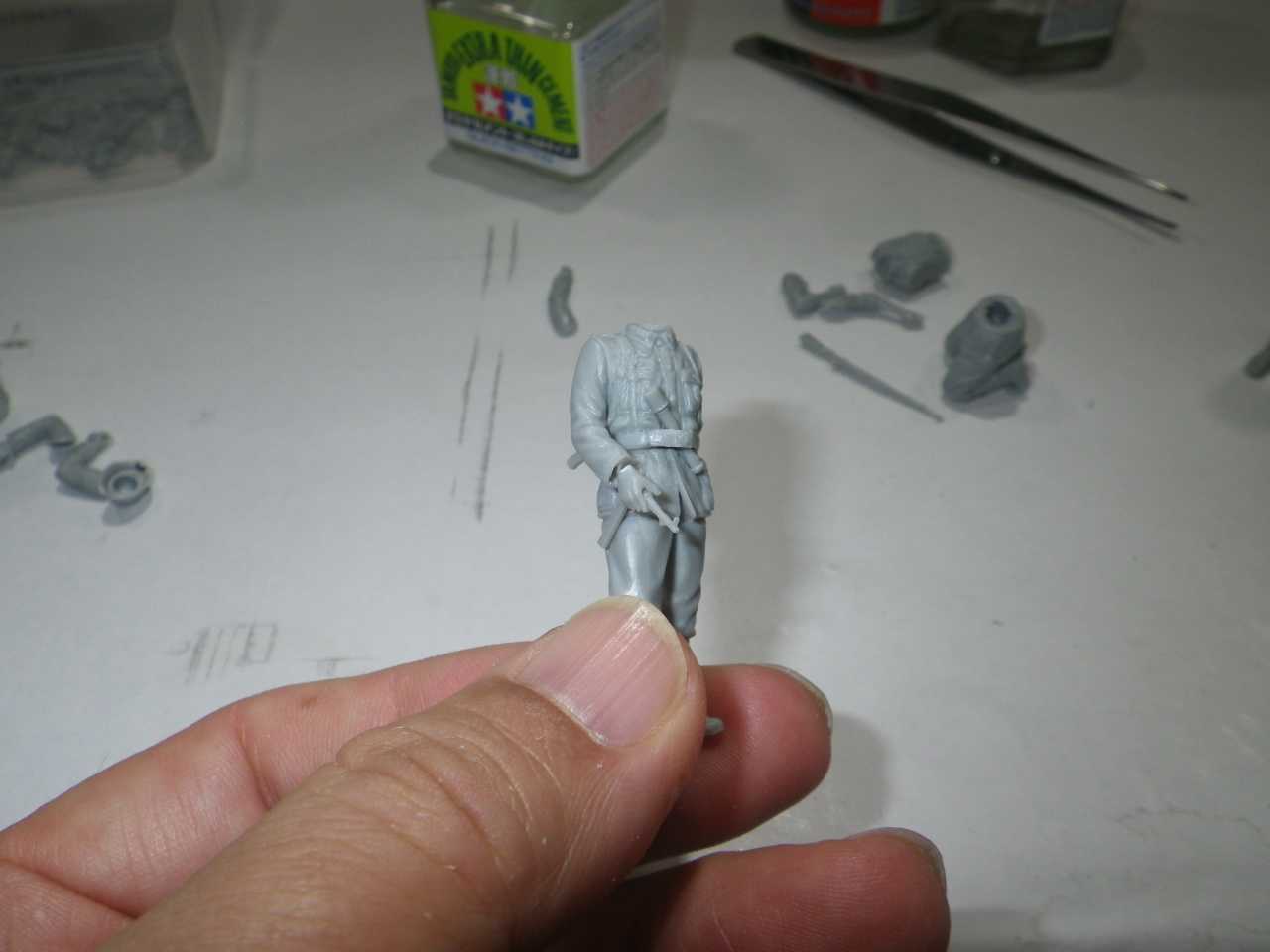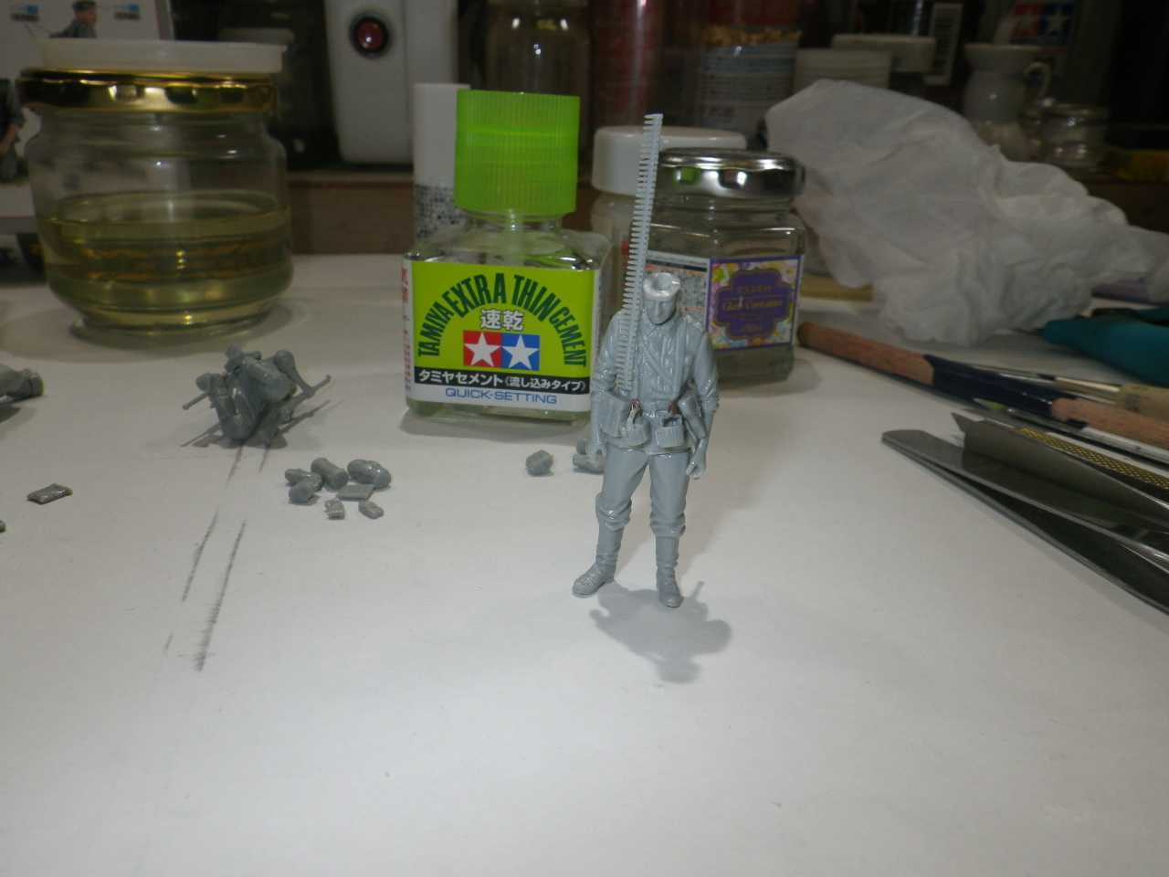 MP40を肩掛けで手で押し下げている兵士ですベルトに手榴弾を挿しています手首と腕と銃が成形のままでは合いません手首を切り離して位置合わせしました腕接着が未硬化のうちにマガジンパウチも取り付けましたパウチに合わせて左腕の取り付け、右腕の肩口を少し開いて調整しました