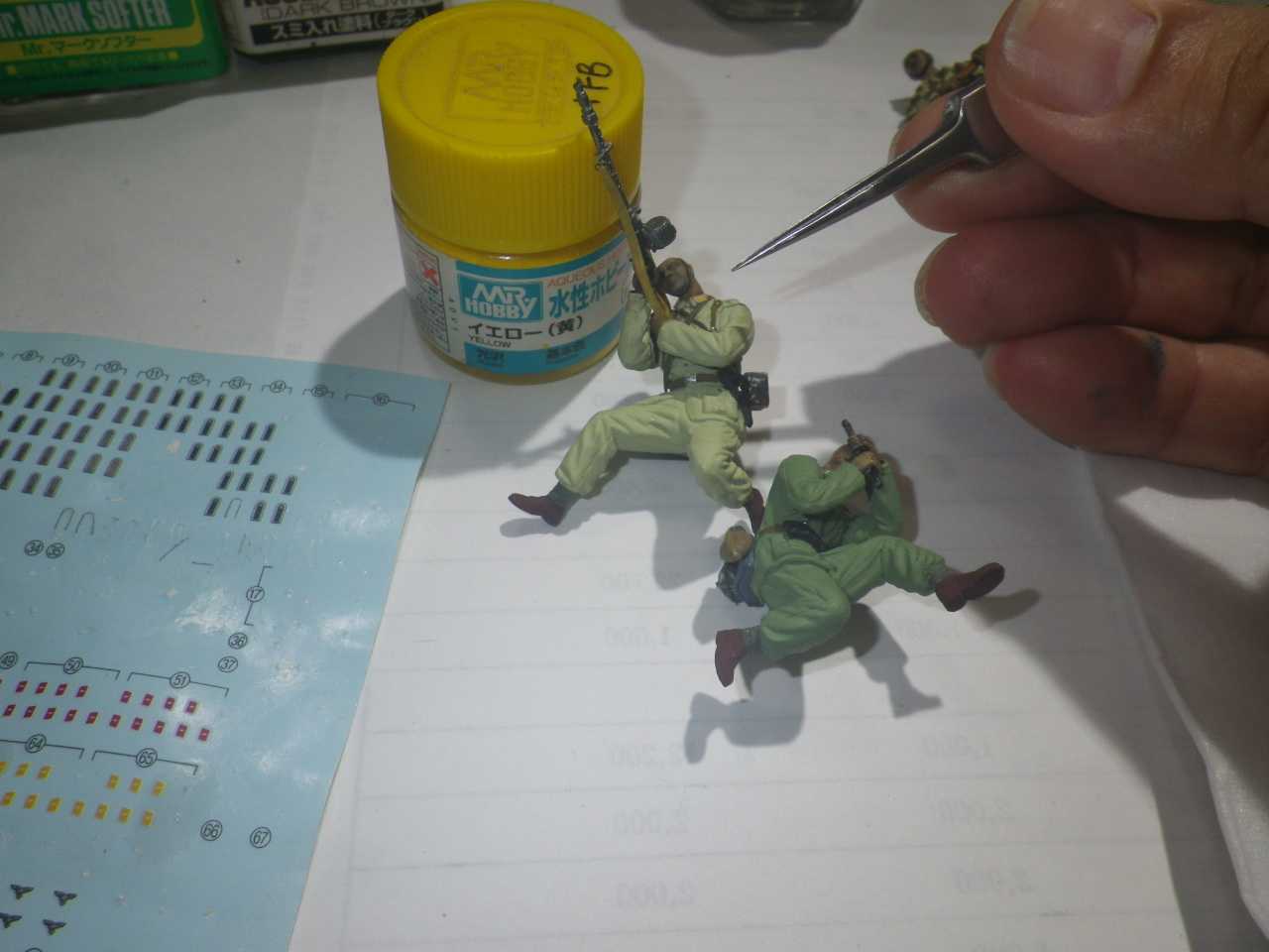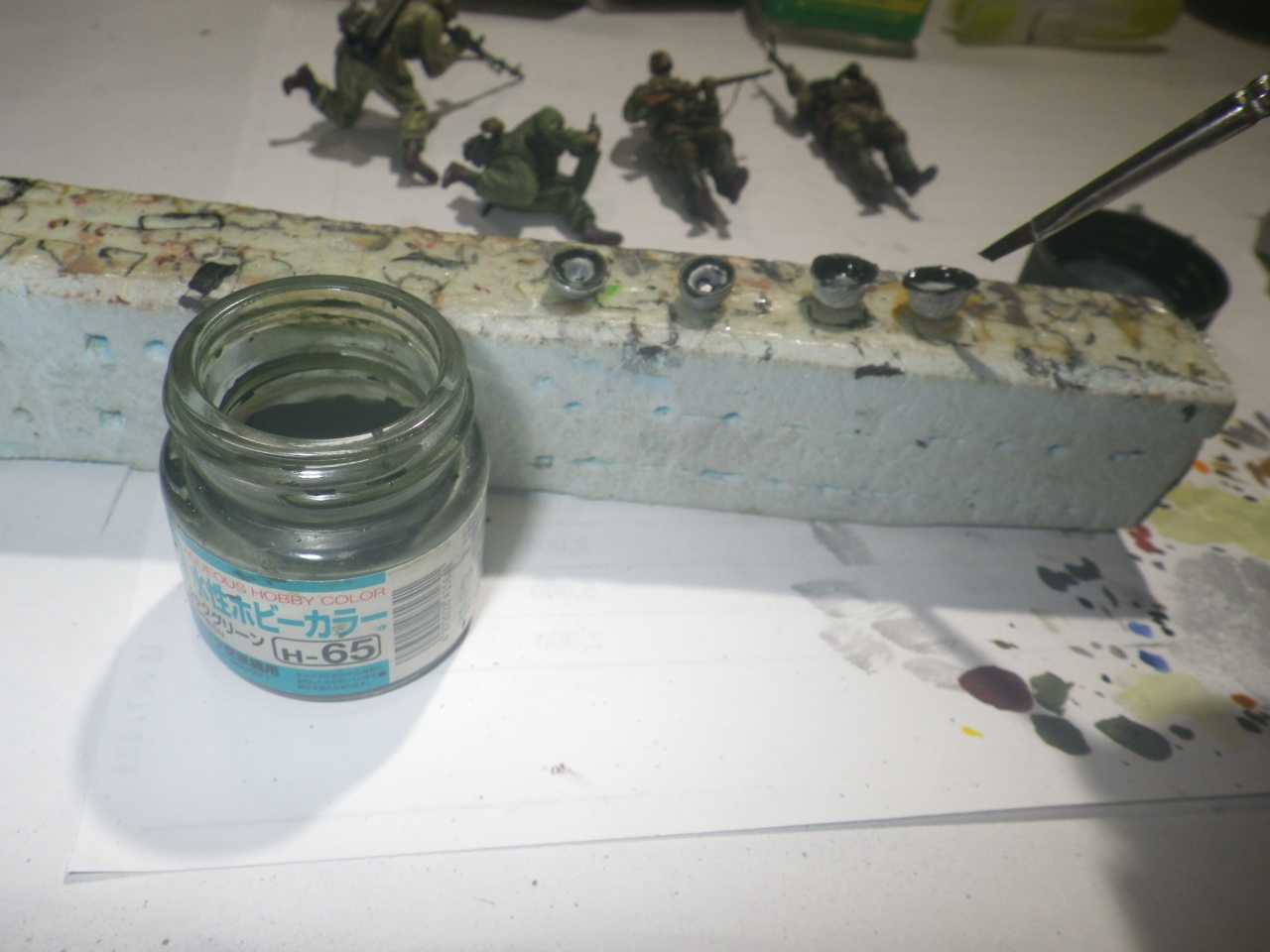 ヘルメットを塗装します水性ホビーカラー H65 RLM70ブラックグリーンで内側を先行塗りします各兵士の頭に被せます近接こんな感じです各兵士のヘルメットに色を乗せていきます機関銃兵二人です水性ホビーカラー H65 RLM70ブラックグリーンでベース塗りします水性ホビーカラー H74 スカイで擬装網をカスレ塗りして網だけに色を付けます近接こんな感じです